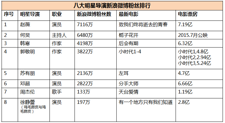 近幾年開(kāi)始,無(wú)數(shù)的明星們搖身一變晉升電影導(dǎo)演,包括演員、歌手、作家,這好像也成為了娛樂(lè)圈之中的一大趨勢(shì),而且最重要的是他們領(lǐng)導(dǎo)的處女作都有著不錯(cuò)的票房,這里面對(duì)票房最大的貢獻(xiàn)我想應(yīng)該就是他們利用了互聯(lián)網(wǎng)時(shí)代的粉絲經(jīng)濟(jì),讓我們看一下近幾年新晉導(dǎo)演的票房成績(jī)和他們的微博粉絲數(shù)量。