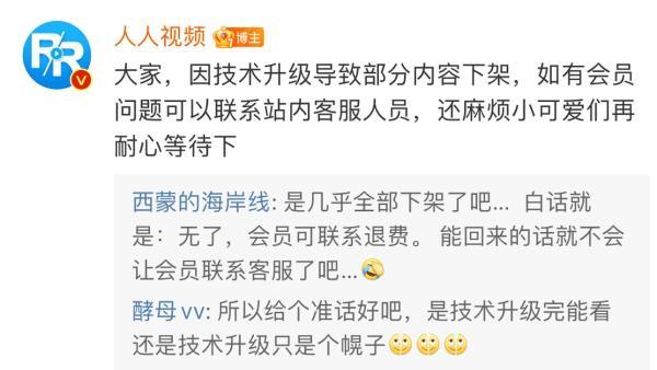 對此,人人視頻官方賬號在微博平臺回應(yīng)稱,“因技術(shù)升級導(dǎo)致部分內(nèi)容下架,如有會員問題可以聯(lián)系站內(nèi)客服人員,還麻煩小可愛們再耐心等待下”。