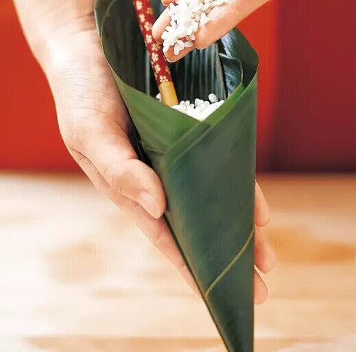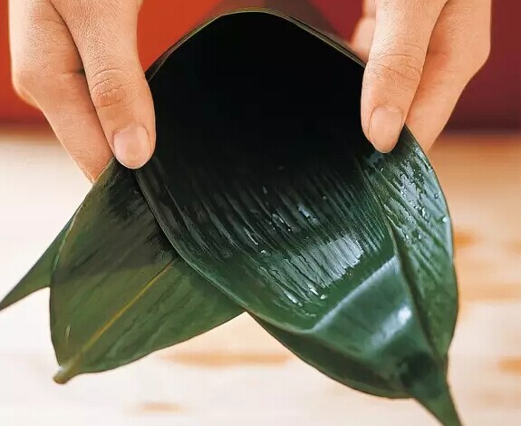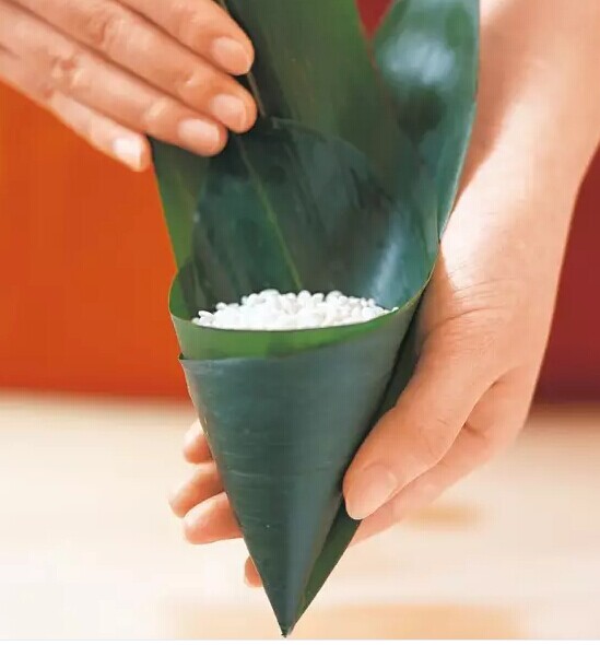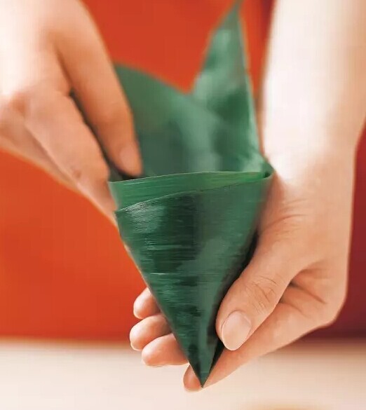 ?雙手捏住粽葉兩端,同時向內(nèi)交叉重疊,折成漏斗形,然后將內(nèi)側的粽葉在漏斗內(nèi)旋轉1圈,再回到原來的位置,使漏斗變成圓錐形。