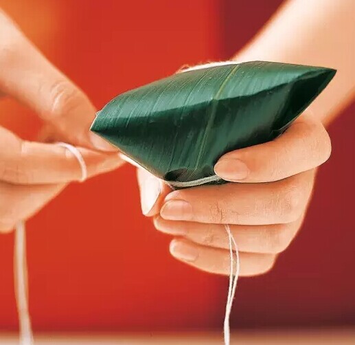 ?用繩子環(huán)繞粽子兩角數(shù)圈,將粽子緊緊裹住,并在頂端扎緊打結。(此步驟非常重要,如果繩子捆得不夠結實,在煮制過程中粽葉會有松開的可能,這樣就前功盡棄了)