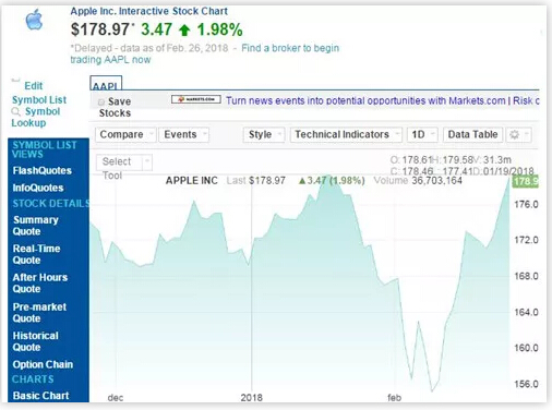由于億萬富翁沃倫·巴菲特高談闊論他旗下公司所持蘋果公司股票,周一美國股市收盤時,蘋果股票價格為178.97美元,較前一交易日175.5美元的收盤價上漲3.47美元,漲幅為1.98%。