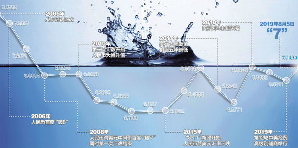 8月5日9時(shí)25分出爐的人民幣對美元中間價(jià)跌穿6.90關(guān)口,報(bào)6.9225,較前一交易日下調(diào)229點(diǎn),中間價(jià)貶至2018年12月3日以來最低。與此同時(shí),當(dāng)日在岸、離岸人民幣雙雙跌“破7”關(guān)口。截至記者18時(shí)35分發(fā)稿,離岸人民幣最低報(bào)7.10570,在岸人民幣最低報(bào)7.04740。