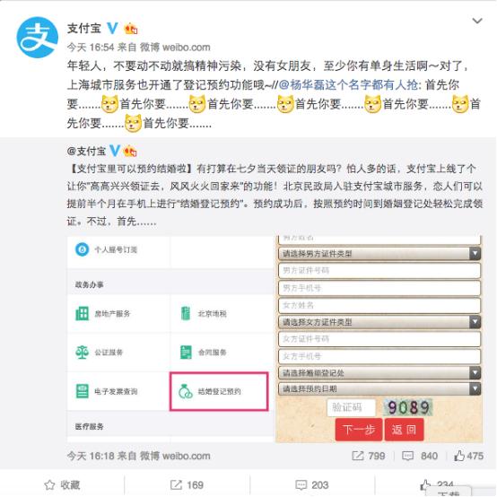據(jù)支付寶官微介紹,目前北京、上海兩個(gè)城市開通“結(jié)婚登記預(yù)約”功能。東邊日出西邊雨,當(dāng)上海、北京的情侶互相在評(píng)論里@另一半的同時(shí),有網(wǎng)友說道“不忘初心,傷害完北京的單身汪,又去傷害上海的單身汪”。