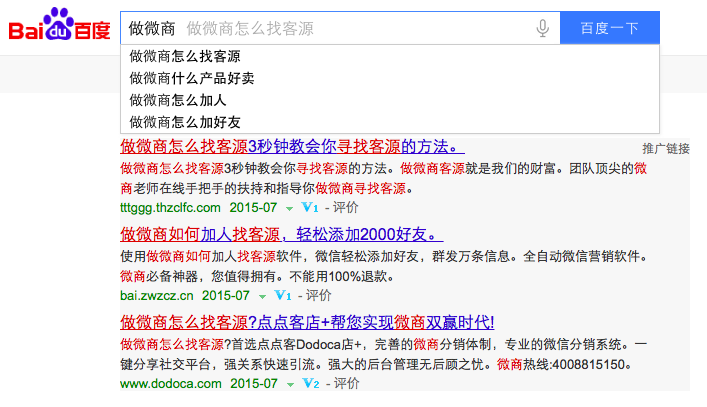 有沒有看到搜索引擎下面會(huì)為你自動(dòng)補(bǔ)充一些關(guān)鍵詞?這就是現(xiàn)在搜索引擎發(fā)展的智能性,如果你平常你喜歡搜索一些問題的話,你就會(huì)發(fā)現(xiàn),搜索引擎會(huì)為自動(dòng)補(bǔ)充一些關(guān)鍵詞。像這種你只需要輸入做微商,搜索引擎就會(huì)自動(dòng)為你推薦一些搜索詞,比如做微商怎么找客源,做微商什么產(chǎn)品好賣等等。
