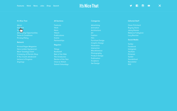 這不是某一種類別的導(dǎo)航,而是一系列的導(dǎo)航方式。往往用在作品集網(wǎng)站上,設(shè)計(jì)師可以天馬行空發(fā)揮創(chuàng)意。這種導(dǎo)航的特點(diǎn)往往是拋棄傳統(tǒng)導(dǎo)航,把導(dǎo)航欄里的條目拆分到頁(yè)面各處。角落往往是最受歡迎的。