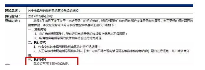 而創(chuàng)意中不得出現(xiàn)近似電話號碼的連續(xù)數(shù)字,則是從今日(5月19日)23:00起執(zhí)行,大家提前修改好創(chuàng)意,避免創(chuàng)意不能生效,從而導致流量異常的尷尬。
