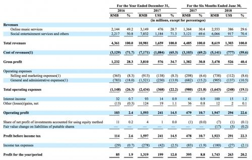 騰訊音樂(lè)招股書(shū)顯示,2018年上半年,其在線音樂(lè)上半年收入25.53億元,社交娛樂(lè)服務(wù)和其他服務(wù)收入60.66億元,分別占到總營(yíng)收86.19億元的29.6%和70.4%,去年同期這一數(shù)據(jù)比例分別為28.7%和71.3%。