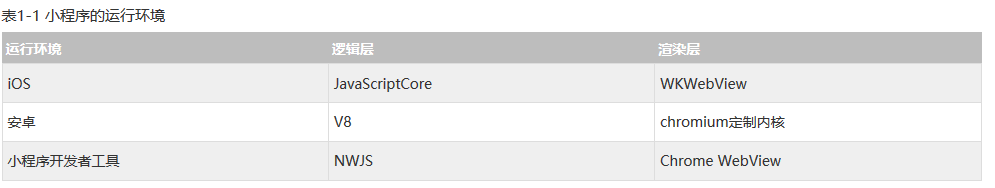網(wǎng)頁(yè)開(kāi)發(fā)者需要面對(duì)的環(huán)境是各式各樣的瀏覽器,PC 端需要面對(duì) IE、Chrome、QQ 瀏覽器等,在移動(dòng)端需要面對(duì) Safari 、Chrome 以及 iOS、Android 系統(tǒng)中的各式 WebView 。而小程序開(kāi)發(fā)過(guò)程中需要面對(duì)的是兩大操作系統(tǒng) iOS 和 Android 的微信客戶(hù)端,以及用于輔助開(kāi)發(fā)的小程序開(kāi)發(fā)者工具,小程序中三大運(yùn)行環(huán)境也是有所區(qū)別的,如表1-1所示。